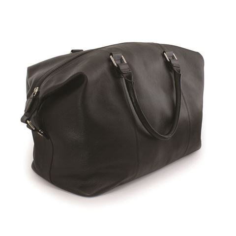 Sandringham Nappa Leather Weekender Bag in black high quality nappa leather supplied in a protective draw string bag. Deboss personalisation recommended for a subtle permanent branding. Features include a large capacity interior with black lining, Press stud lock extended zip for easy packing, Padded carry handles, Optional shoulder strap, Black zip with leather tab zip pull, protective metal feet to protect the bottom of your bag.